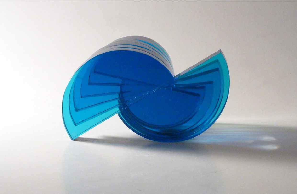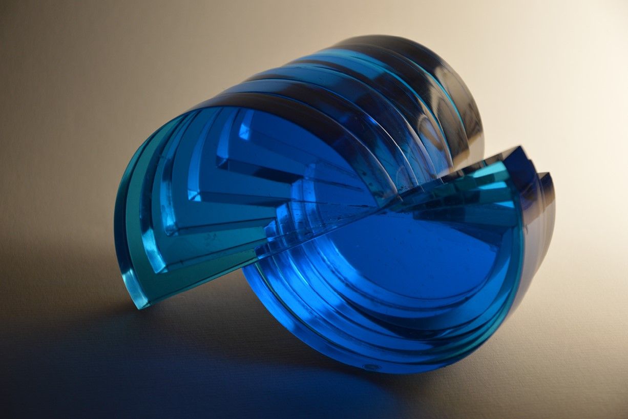 This polished and glued, clear and blue float glass object had been a study of shapes and light refractions using a set of methods and techniques of coldworking.