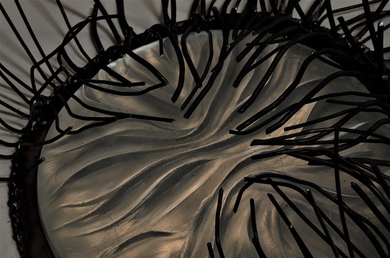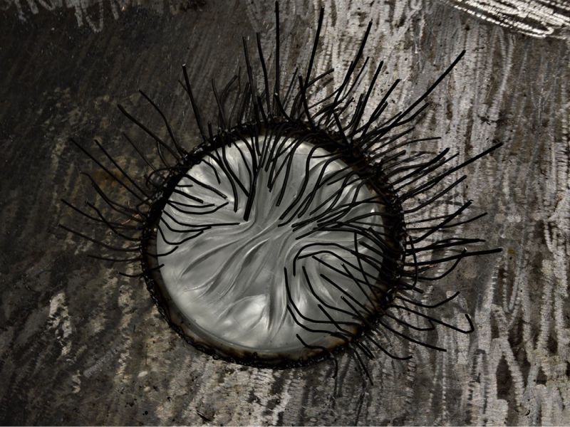 Sol is expressing light and refractions using the shimmering surface of the glass as something inherently capable of transcendency. Light is trapped yet moving, something that is sublime and defying the eyes and the hands. It is a beauty that is guarded by the spikes of its frame, making it impossible to touch, therefore the temptation to touch is rendered impossible.