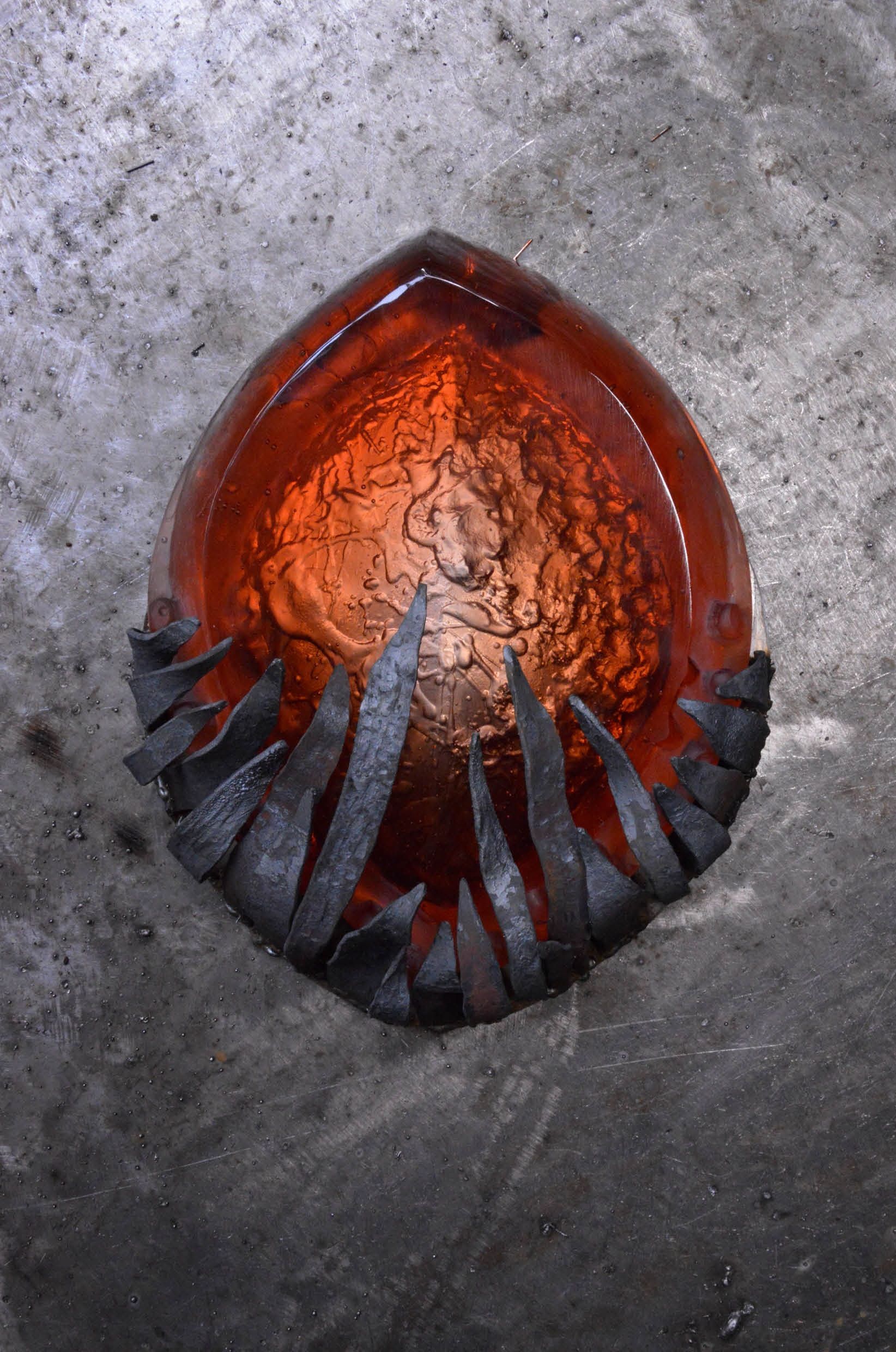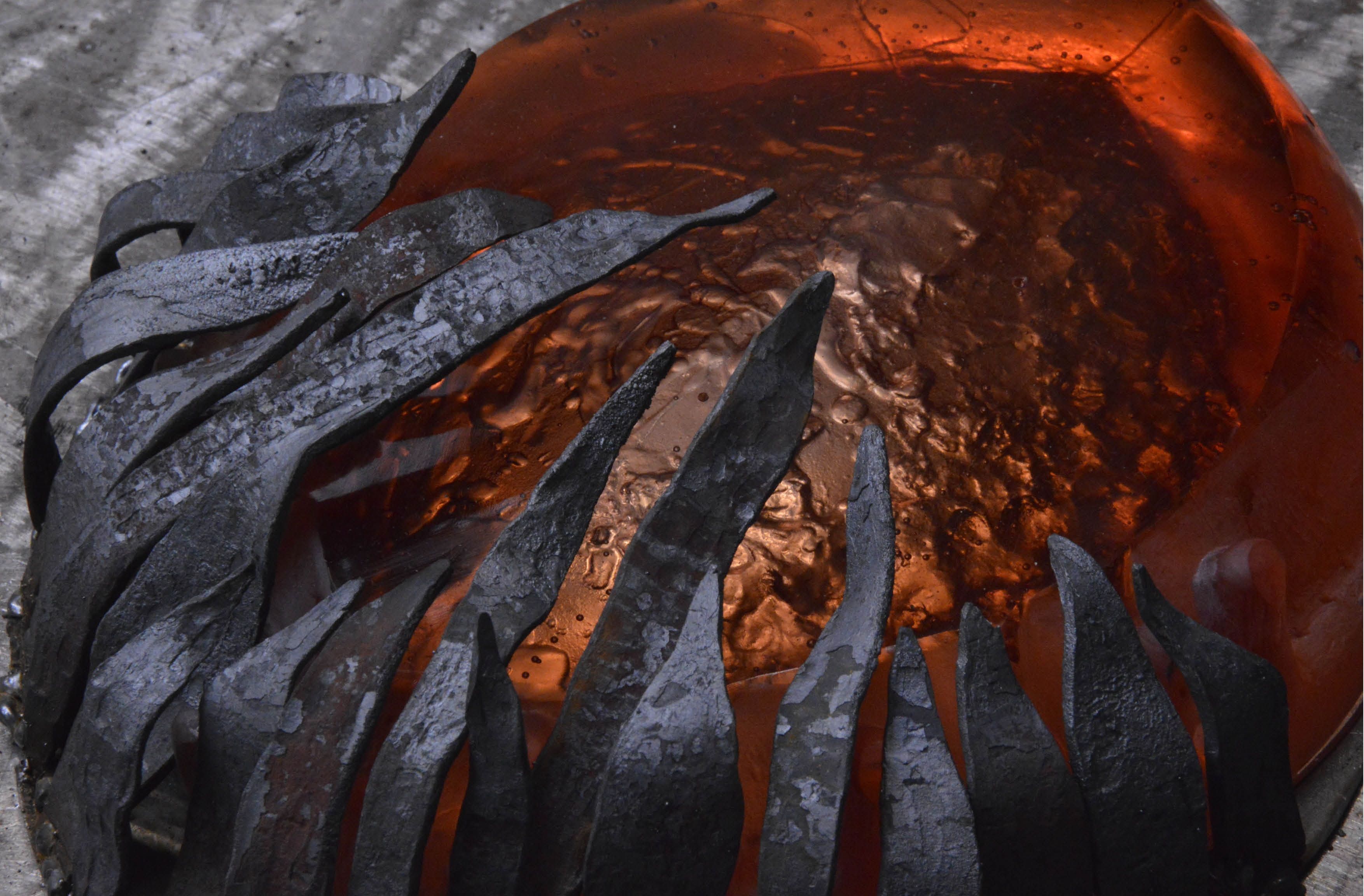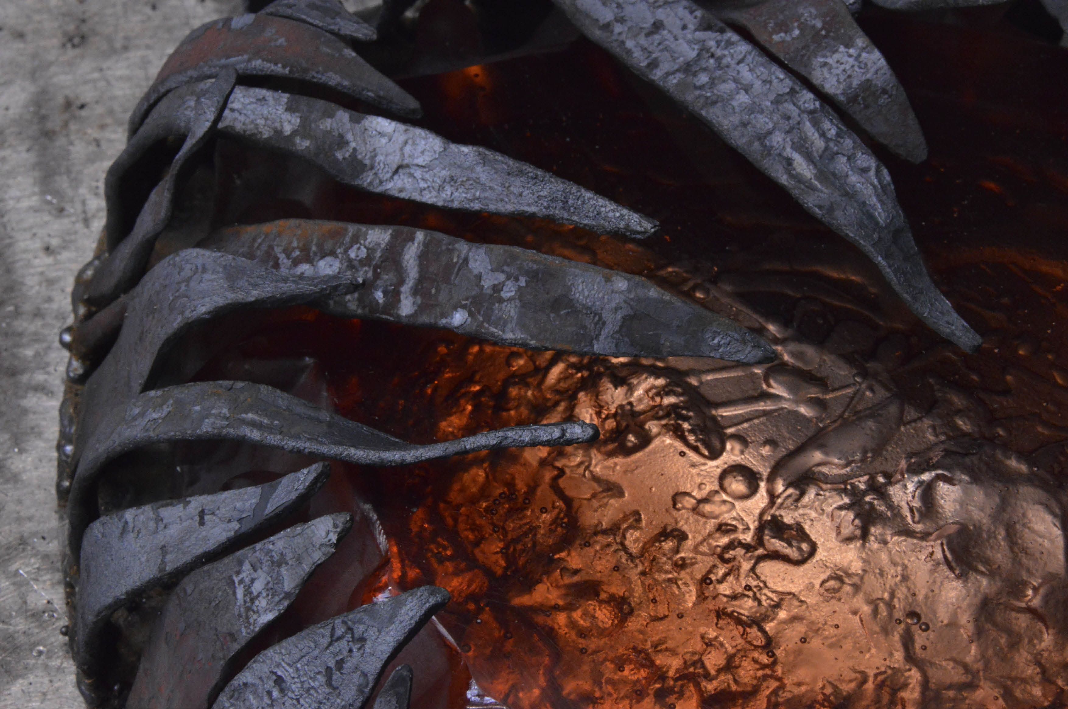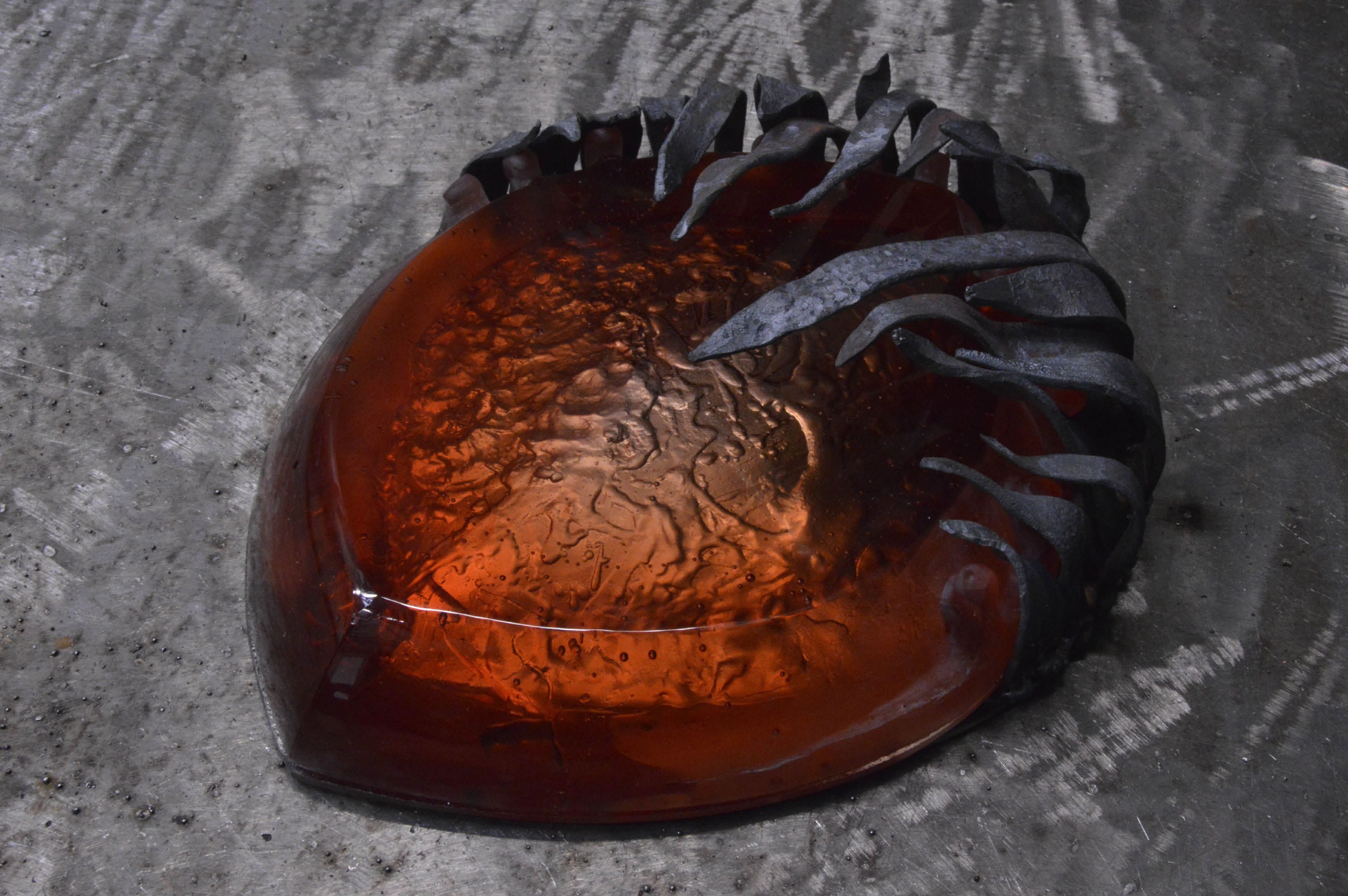 Magma is part of the series, Captured. It is a cast glass object combined with metal, using the materials to work and breathe together in the composition. The smoothness of the glass is being in contrast with its metal frame, yet the represented waves are in a sort of delusive harmony.
